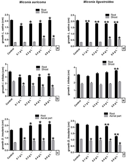 Initial growth of seedlings of (a–d) lettuce (L. sativa), (b–e) morning glory (I. triloba), and (c–f) sourgrass (D. insularis) under crude extract of (a–c) Miconia auricoma and (d–f) Miconia ligustroides. ** Indicates means ± SEM with statistically significant differences by Dunnett’s test (p < 0.05) compared to the test control; * Indicates means ± SEM with statistically significant differences by Dunn’s test (p < 0.05) compared to the control test.