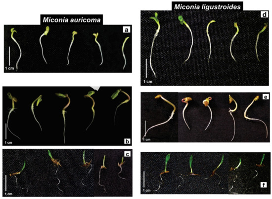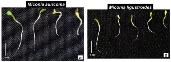 Morning glory seedlings were susceptible to the phytotoxic effects of M. auricoma FCHCl3. Root growth was progressively inhibited with increasing concentrations, with a mean reduction of 28–65%, and was statistically different from the control (Figure 3b). The same occurred in bioassays with M. ligustroides FCHCl3, with significant average inhibitions of 40% (Figure 3e). M. auricoma FCHCl3 significantly reduced the length of the shoot, except at a 0.4 g·L−1 concentration (Figure 3b). M. ligustroides FCHCl3 reduced the length of the shoot by an average of 29% at all concentrations tested, and it was statistically different from the control (Figure 3e). Similar observations occurred with the seedlings under the M. ligustroides FCHCl3 solutions. Morning glory seedlings with twisted hypocotyls, cotyledonary leaves with yellowish ends, and which were not expanded or contained in the seminal tegument were found in the bioassays with Miconia sp. FCHCl3 (Figure 4b,e).
