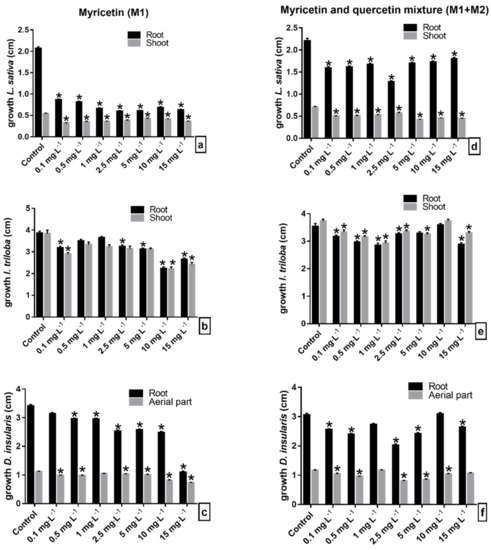 Initial growth of seedlings of (a–d) lettuce (L. sativa), (b–e) morning glory (I. triloba), and (c–f) sourgrass (D. insularis) under solution of flavonoids (a–c) myricetin (M1) and (d–f) myricetin+quercetin mixture (M1 + M2). * Indicates means ± SEM with statistically significant differences by Dunn’s test (p < 0.05) compared to the control test.