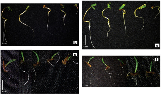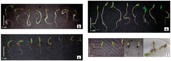 To overcome dormancy, the morning glory seeds were submerged in H2SO4 P.A. for 40 min, followed by washing in running water for 5 min [74,75]. Morning glory seeds, sourgrass caryopses, and lettuce cypselas were placed to germinate in a germination chamber under a 12 h photoperiod (light–dark), and for 24 h for morning glory and lettuce, at temperatures of 30 °C and 25 °C, respectively, and for 48 h at 30 °C for sourgrass caryopses.