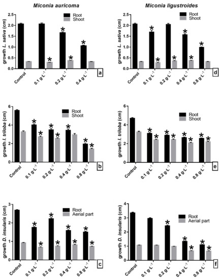 Initial growth of seedlings of (a–d) lettuce (L. sativa), (b–e) morning glory (I. triloba), and (c–f) sourgrass (D. insularis) under chloroform fraction of (a–c) Miconia auricoma and (d–f) Miconia ligustroides: (a–d) lettuce, (b–e) morning glory, and (c–f) sourgrass. * Indicates means ± SEM with statistically significant differences by Dunn’s test (p < 0.05) compared to the control test.