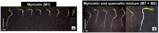Myricetin and quercetin, besides being antioxidants, act in defense and protect plant roots against parasitic nematodes [44]. In contrast to its activity as an antioxidant, myricetin can act as an oxidant of Fe2+ ions and thus can be harmful to the DNA structure [45], and at the same time can act as a mutagenic and cytoprotective substance to animal cellular DNA [46,47], a role that is related to its molecular structure. In this way, myricetin can also be harmful to plant cells, since, as it exhibits genotoxic properties, as described above, it can affect the cell division process of plant tissues, organelles such as mitochondria and chloroplasts, and affect the homeostatic balance and the photosynthetic apparatus through oxidative stress, and thus inhibit seedling growth.