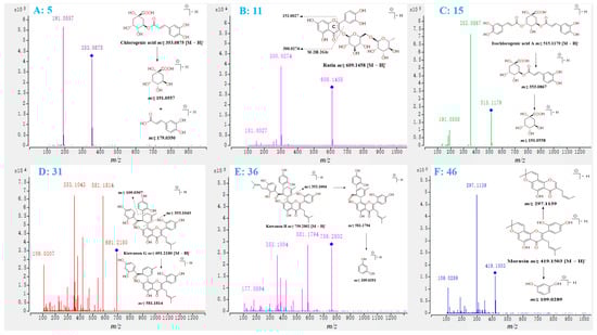 In the MS/MS spectra of compounds 5 and 15 (Figure 1A,C), the primary fragmentation pathway was the cleavage of the bond between quinic acid and caffeic acid, and the formation of the high abundance ions at m/z 353.0867 and 191.0558 (or 191.0557 for quinic acid) was seen [11]. Three fragmentation pathways predominated in the MS/MS spectra of compounds 11, 31, 36 and 46 (Figure 1B,D–F). The first fragmentation was a neutral loss of all sugar moieties or substituent groups, which was connected to the flavonoid skeleton, from the deprotonated flavonoid and formation of the high abundance fragments. In the MS/MS spectra of compounds 11, 31, and 36, the high abundance ions at m/z 300.0274, 353.1043, and 353.1004 were produced by the loss of all sugar moieties or substituent groups from the deprotonated flavonoids at m/z 609.1458, 691.2108, and 759.2802, respectively (Figure 1B,D,E). The second fragmentation behavior was the cleavage of the C-ring of the flavonoid skeleton and the formation of a series of fragments in the low m/z zone, which was investigated in previous studies [11,12]. The third fragmentation pattern was the loss of some small substituent groups, such as H2O, CO, and the catechol moiety, from the parent ion. Take compounds 31, 36, and 46 for example. The fragment ions at m/z 109.0307, 109.0291, and 109.0289 were formed by the loss of a catechol moiety from the parent ions at m/z 691.2108, 759.2802, and 419.1503, respectively. The loss of catechol moiety from the parent ions and the formation of the fragments at m/z 109.0290 (theoretical value) was rarely reported in previous studies.