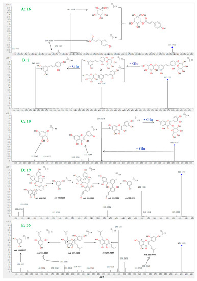 Identification compounds 16 (A), 2 (B), 10 (C), 19 (D), and 35 (E) based on their MS/MS spectra and the corresponding characteristic fragment ions.