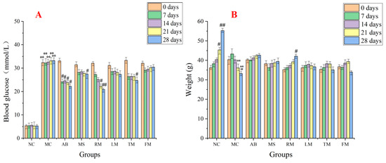 The effect of daily administration of M. alba roots, leaves, twigs, and fruits extracts on the blood glucose concentration (A) and the body weight variation (B) of T2D mice. Data are reported as mean ± SD. For statistical significance, ** p < 0.01 compared with the normal control group on the same days. # p < 0.05, ## p < 0.01 compared with the data at the 0 days. NC: normal group; MC: model group; AB: acarbose group (positive control, 50 mg/kg); MS: morusin group (50 mg/kg); RM: roots of M. alba group (200 mg/kg); LM: leaves of M. alba group (200 mg/kg); TM: twigs of M. alba group (200 mg/kg); FM: fruits of M. alba group (200 mg/kg).