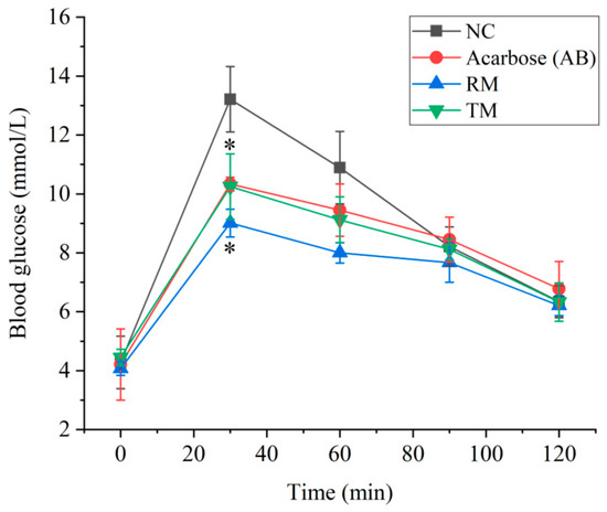 Postprandial glycemia level of normal mice after administration of sucrose, acarbose, roots, and twig extracts. * p < 0.05 compared with the normal control group at the 30 min. NC: normal group; AB: acarbose group (positive control, 50 mg/kg); RM: roots of M. alba group (200 mg/kg); TM: twigs of M. alba group (200 mg/kg).