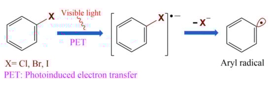 - Qiu, G.; Li, Y.; Wu, J. Recent developments for the photoinduced Ar–X bond dissociation reaction. Org. Chem. Front. 2016, 3, 1011–1027. [Google Scholar] [CrossRef]