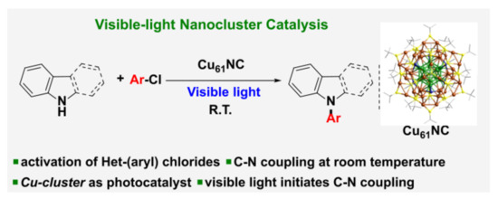 - Sagadevan, A.; Ghosh, A.; Maity, P.; Mohammed, O.F.; Bakr, O.M.; Rueping, M. Visible-light copper nanocluster catalysis for the C-N coupling of aryl chlorides at room temperature. J. Am. Chem. Soc. 2022, 144, 12052–12061. [Google Scholar] [CrossRef]
