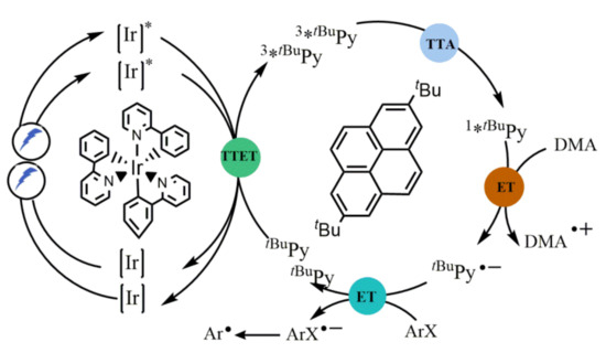 Wenger reported a new two-center photoredox reaction system of fac-[Ir(ppy)3]/tBuPy/DMA (ppy = 2-phenylpyridine; tBuPy = 2,7-di-tert-butyrypyrene; DMA = N,N-dimethylformamide), which was not only suitable for photocatalytic aryl dehalogenations but also for pinacol couplings and detosylation reactions (Figure 8) [38]. Notably, they detected all relevant reaction intermediates directly by transient absorption and emission spectroscopy and determined the mechanism of sensitization-initiated electron transfer works for this system. Combining with spectral data, they determined that the reaction was consisted of triplet–triplet energy transfer (TTET), triplet–triplet annihilation upconversion (TTA-UC), pyrenyl radical anion formation, and substrate activation (Figure 8). The sensitization-initiated photoredox process makes it possible to activate stable chemical bonds using extremely reductive molecules that do not absorb visible light.