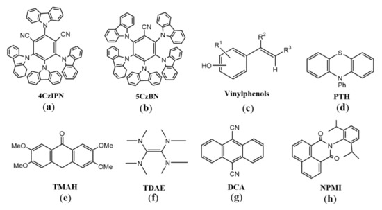 Organic photocatalysts involving single-photon excitation. (a) 4CzIPN: 1, 2, 3, 5-tetrakis (carbazol-9-yl)-4, 6-dicyanobenzene; (b) 5CzBN: carbazolyl cyanophenyl; (c) Vinylphenols; (d) PTH: N-phenylphenothiazine; (e) TMAH: 2, 3, 6, 7-tetramethoxyanthrone; (f) TDAE: tetramine (dimethylamine) ethylene; (g) DCA: 9, 10-dicyano-anthracene; (h) NPMI: 1, 8-naphthimide.