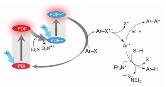 Organic proposed mechanism of reduction of aryl halides with PDI by consecutive visible light-induced electron transfer processes. Reprinted with permission from Ref. [19]. Copyright 2014, The American Association for the Advancement of Science.