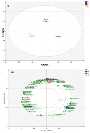 PCA score plot: (a) biplot; (b) based on GC-MS chemical profile of the essential oils of different Salvia species as displayed in Table 1. S. officinalis (So), S. virgata (Sv) and S. sclarea (Ss).