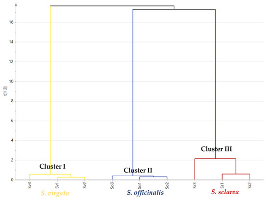 Additionally, HCA was applied as an unsupervised pattern recognition method to support results obtained by PCA. Figure 2 shows the HCA dendrogram, which displays segregation of different Salvia species in three main clusters. Cluster I, II and III present S. virgata (Sv), S. officinalis (So) and S. sclarea (Ss), respectively. The HCA dendrogram reveals the closeness of S. officinalis (So) and S. sclarea (Ss). HCA results endorse that of PCA.
