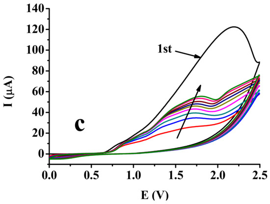 The ten consecutive cyclic voltammograms of 2-phenylphenol (a); 3-phenylphenol (b); 4-phenylphenol (c) in methyl isobutyl ketone (c = 50 mM, supporting electrolyte = 70 mM TBAP, and v = 0.1 V/s).