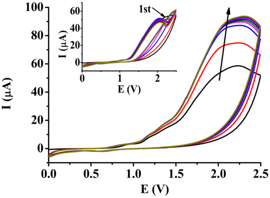 A schematic representation of the experimental procedure is shown in Figure 2 showing how the deposition was carried out on the platinum electrode. The solvents methyl isobutyl ketone and mesityl oxide had interesting effects on the electropolymerization reactions; thus, in the first part of our study, the electropolymerization reactions of the three phenylphenol isomers were explored by taking ten subsequent cyclic voltammograms between 0 and 2.5 V with a 0.1 V/s scan rate. In phenylphenols, the neighboring aromatic groups displayed electronic interactions due to the conjugation of the highly delocalized electronic system, which also affected their electrochemical polymerization reactions. When they were investigated, themselves, the differences between isomers could be estimated and a few signs regarding the polymer structures could mostly be found to be related to porosity. A light brown deposit was formed in both solvents from each of the isomers, but the layers deposited from mesityl oxide were thicker. They could easily be removed mechanically from the platinum surface, indicating weak adhesion. The CVs in methyl isobutyl ketone demonstrated deactivation of the platinum electrode in the case of the three phenylphenol isomers (Figure 3). These findings are in accordance with our earlier investigations when phenol was the substrate [14]. This process was very strong (especially remarkable) in the case of 3-phenylphenol. During the entire electropolymerization process, no tendency towards a decrease in the anodic peak currents of the monomers was observed. This was due to the swelling of the organic deposits in methyl isobutyl ketone. However, phenylphenols are bulky substrates due to the phenyl substituents, leading to more open structures of polymers, which is why swelling of their polymers was more pronounced, especially in ketone solvents.