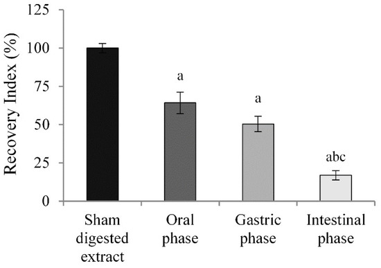 Finally, in order to determine the amount of ACN left after each step of the in vitro digestion process, the recovery index (RI) was calculated following the method reported by Ortega and coworkers [64].