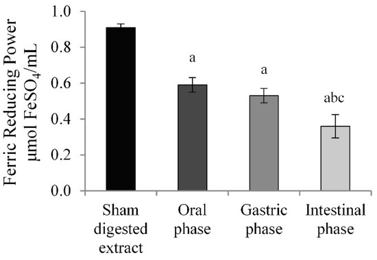 FRAP assay. Results are reported as μmol FeSO4/mL of sham-digested or digested extract and expressed as mean ± SD of three independent experiments.a p < 0.05 vs. sham-digested extract; b p < 0.05 vs. oral phase c p < 0.05 vs. gastric phase.