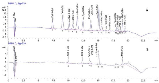 HPLC–DAD representative chromatograms (see the text for details). Anthocyanin profile of sham-digested extract (A) and intestinal digested phase (B). The chromatograms were acquired at 520 nm. Peaks: 1–Delphinidin–3–galactoside; 2–Delphinidin–3–glucoside; 3–Cyanidin–3–galactoside; 4–Delphinidin–3–arabinoside; 5–Delphinidin–3–rutinoside; 6–Cyanidin–3–glucoside; 7 + 8 Cyanidin–3–arabinoside + Petunidin–3–galactoside; 9–Cyanidin–3–Rutinoside; 10–Petunidin–3–glucoside; 11–Peonidin–3–galactoside; 12–Petunidin–3–arabinoside; 13–Peonidin–3–glucoside; 14–Malvidin–3–galactoside; 15–Peonidin–3–arabinoside; 16–Malvidin–3–glucoside; 17–Malvidin–3–arabinoside.