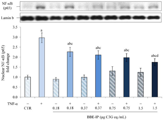 Nuclear NF-κB (p65). Differentiated Caco-2 cells were pretreated or not for 24 h with different concentrations of the BBE-IP (0.18, 0.37, 0.75, 1.5 μg C3G eq./mL). Cells were subsequently exposed to 50 ng/mL TNF-α for 6 h. Cells treated with the vehicles alone were used as controls (CTR). Results are reported as fold change against CTR and expressed as mean ± SD of three independent experiments. p65 values were normalized to the corresponding Lamin b value. a p < 0.05 vs. CTR; b p < 0.05 vs. TNF-α; c p < 0.05 vs. same BBE-IP dose unexposed to TNF-α; d p < 0.05 vs. BBE-IP 0.18 exposed to TNF-α.