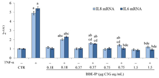 IL-8 and IL-6 mRNA expression. Differentiated Caco-2 cells were pretreated or not for 24 h with different concentrations of the BBE-IP (0.18, 0.37, 0.75, 1.5 μg C3G eq./mL). Cells were subsequently exposed to 50 ng/mL TNF-α for 6 h. Cells treated with the vehicles alone were used as controls (CTR). IL-6 and IL-8 mRNA expressions were analyzed by real time PCR and data are expressed as 2−ΔΔCt and normalized to CTR. 18S rRNA was used as housekeeping gene; a p < 0.05 vs. CTR; b p < 0.05 vs. TNF-α; c p < 0.05 vs. all BBE-IP concentrations not exposed to TNF-α; d p < 0.05 vs. BBE-IP 0.18 μg C3G eq./mL + TNF-α; e p < 0.05 vs. BBE-IP 0.37 μg C3G eq./mL + TNF-α.