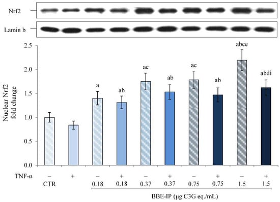 Nuclear Nrf2. Differentiated Caco-2 cells were pretreated or not for 24 h with different concentrations of the BBE-IP (0.18, 0.37, 0.75, 1.5 μg C3G eq./mL). Cells were subsequently exposed to 50 ng/mL TNF-α for 6 h. Cells treated with the vehicles alone were used as controls (CTR). Results are reported as fold change against CTR and expressed as mean ± SD of three independent experiments. Nrf2 values were normalized to the corresponding Lamin b value. a p < 0.05 vs. CTR; b p < 0.05 vs. TNF-α; c p < 0.05 vs. BBE-IP 0.18 unexposed to TNF-α; d p < 0.05 vs. BBE-IP 0.18 exposed to TNF-α; e p < 0.05 BBE-IP 0.37 unexposed to TNF-α; i p < 0.05 BBE-IP 1.5 unexposed to TNF-α.