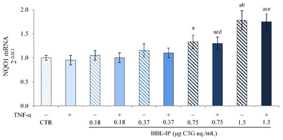 Additionally, the transcriptional activity of Nrf2 was confirmed by determining the gene expression of NQO1, a gene that presents an ARE sequence. The data in Figure 7 show that TNF-α had no effect on NQO1 levels, as also previously reported [18]. The pretreatment with BBP-IP induced the overexpression of NQO1 mRNA starting from the concentration of 0.75 μg C3G eq./mL, both in cells exposed or not to TNF-α.