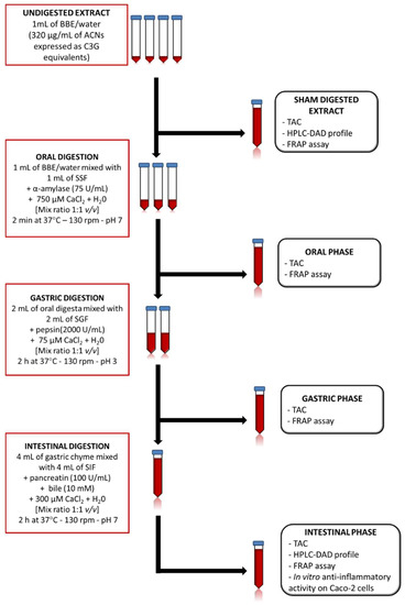 The blackcurrant and bilberry extract (BBE) (Medox®; Biolink Group AS, Sandnes, Norway) used in the present study is an anthocyanin enriched dietary supplement, commercially available, consisting of 17 purified ACN (all glycosides of cyanidin, peonidin, delphinidin, petunidin, and malvidin) isolated from wild bilberries (Vaccinium myrtillus) and blackcurrant (Ribes nigrum). The in vitro gastrointestinal digestion of BBE was carried out following the method described by Minekus and coworkers [61]. The in vitro gastrointestinal digestion consists of three phases: oral, gastric, and intestinal (small intestinal) phase (Figure 8).