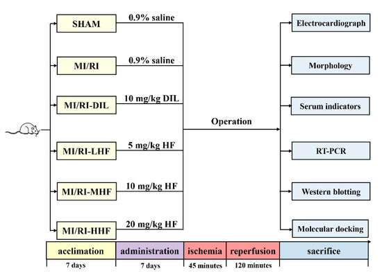 All study protocols were performed and were approved by the Ethics Committee of the Medical College of Qinghai University. All endeavors were intended to reduce the population of animals sacrificed and to reduce animal suffering. Sprague Dawley (SD) male rats (n = 96, weight = 170 ± 10 g, 8 weeks old) were purchased from HFK Bioscience Co., Ltd. (Beijing, China). After 7 days of acclimatization, all rats were randomly divided into 6 groups: (1) sham group (SHAM), (2) MI/RI group (MI/RI), (3) MI/RI-Diltiazem (MI/RI-DIL), (4) MI/RI-low dose of HF (MI/RI-LHF), (5) MI/RI-medium dose of HF (MI/RI-MHF), and (6) MI/RI-high dose of HF (MI/RI-HHF). The SHAM and MI/RI groups were injected intraperitoneally with 0.9% saline for seven days. The MI/RI-DIL group were injected intraperitoneally with DIL (10 mg/kg body weight) for seven days [30]. The MI/RI-LHF, MI/RI-MHF, and MI/RI-HHF groups were injected intraperitoneally with HF (5, 10, and 20 mg/kg body weight, respectively) for seven days. All operations were performed 12 h after the last administration. For rats in the SHAM group, a sham operation was performed without ligating the LAD, while rats were ligated for 45 min to cause the occlusion of then LAD and then underwent 120 min of perfusion in the MI/RI, MI/RI-DIL, MI/RI-LHF, MI/RI-MHF, and MI/RI-HHF groups. BIO PAC MP150 was used to acquire the HR and ECG. After reperfusion, left ventricle (LV) samples were obtained and immediately frozen at −80 °C for further analysis. Blood samples were acquired from the abdominal aorta and centrifuged at 4 °C (3000 rpm for 15 min) to acquire samples, which were stored at −80 °C for the follow-up study.