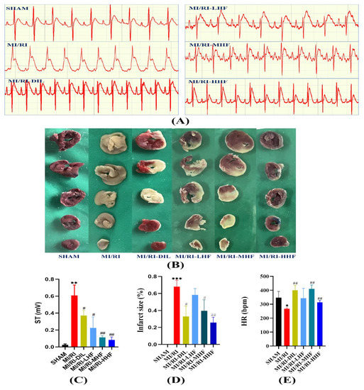 To investigate the effects of HF on the ECG, the ECG and HR were used to appraise the effects. Compared with the SHAM group, a significant elevation in the ST segment of the ECG and a significant reduction in the heart rate were observed in the MI/RI group (p < 0.05; Figure 2A,C,E). Compared with the MI/RI group, the pretreatment with DIL and HF significantly ameliorated these changes in the MI/RI-DIL, MI/RI-LHF, MI/RI-MHF, and MI/RI-HHF groups (p < 0.05; Figure 2A,C,E).