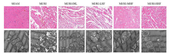 Hematoxylin-eosin (HE) staining and transmission electron microscopy (TEM) were used to detect the abnormal myocardial tissue. The SHAM group showed normal myocardial architecture. Compare with the SHAM group, the cardiomyocytes displayed degeneration and atrophy of the myocardial fibers and exudation of red blood cells in the MI/RI group. Compared with the MI/RI group, the pretreatment with DIL and HF alleviated the degeneration of the myocardial fibers (Figure 2). Based on the TEM, the SHAM group showed normal interfibrillar mitochondria (IFM) and myocardial fibers, while the MI/RI rats demonstrated injured IFMs. However, the pretreatment with DIL and HF relieved these abovementioned changes in the MI/RI-DIL, MI/RI-LHF, MI/RI-MHF, and MI/RI-HHF groups (Figure 3).