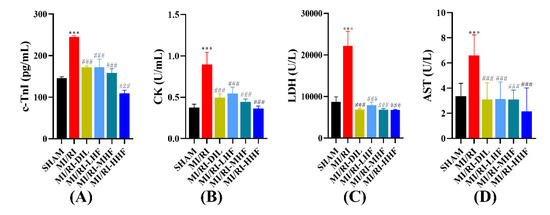 Effects of HF on myocardial injury markers. (A) c-TnI (n = 15~16). (B) CK (n = 15~16). (C) LDH (n = 15~16). (D) AST (n = 15~16). Results were expressed as mean ± SD. *** p < 0.001 vs. SHAM group. ### p < 0.001 vs. MI/RI group.
