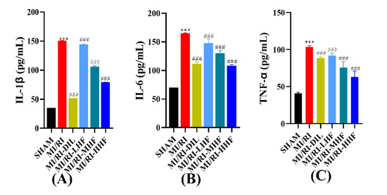 Effects of HF on inflammatory cytokines. (A) IL-1β(n = 15~16). (B) IL-6 (n = 15~16). (C) TNF-α (n = 15~16). Results were expressed as mean ± SD. *** p < 0.001 vs. SHAM group. ### p < 0.001 vs. MI/RI group.