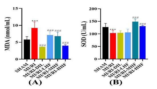 Oxidative stress markers were comprised of superoxide dismutase (SOD) and malondialdehyde (MDA), which were used to measure the oxidative stress response of the cardiomyocytes. Compared with the SHAM group, a marked increase in the serum of MDA, and a prominent decrease in the serum of SOD, were observed in the MI/RI group (p < 0.05; Figure 6A,B). Compared with the MI/RI group, the pretreatment with DIL and HF significantly alleviated these alterations in the MI/RI-DIL, MI/RI-LHF, MI/RI-MHF, and MI/RI-HHF groups (p < 0.05; Figure 6A,B).