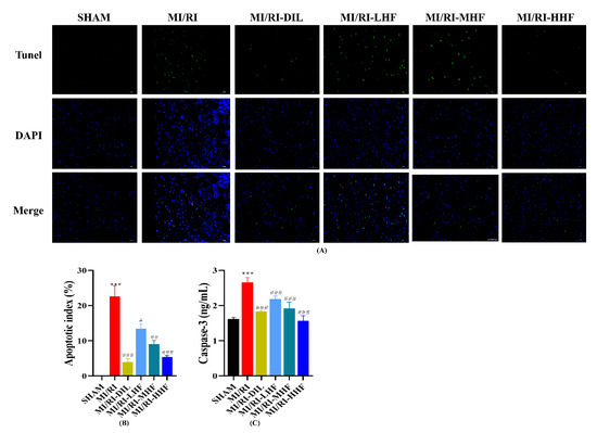 Effect of HF on TUNEL positivity and apoptotic markers. (A) The results of the TUNEL assay (400×). (B) Apoptotic index. (C) The serum of caspase-3. *** p < 0.001 vs. SHAM group. # p < 0.05, ## p < 0.01, ### p < 0.001 vs. MI/RI group.