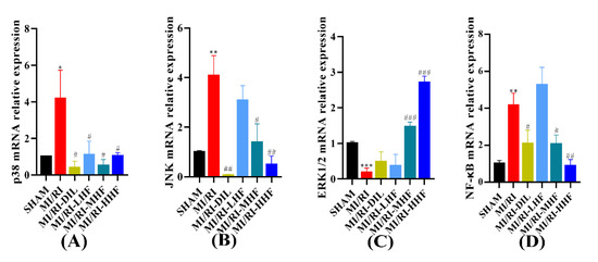 Effect of HF on MAPK/NF-κB mRNA expression. (A) p38 mRNA relative expression. (B) JNK mRNA relative expression. (C) ERK1/2 mRNA relative expression. (D) NF-κB mRNA relative expression. * p < 0.05, ** p < 0.01, *** p < 0.001 vs. SHAM group. # p < 0.05, ## p < 0.01, ### p < 0.001 vs. MI/RI group. (n = 3).