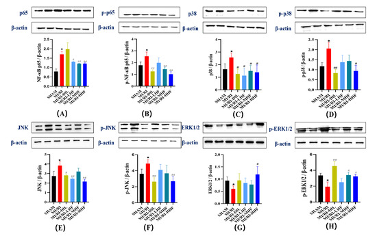 Effect of HF on MAPK/NF-κB protein expression. (A) NF-κB p65 protein relative expression. (B) p-NF-κB p65 protein relative expression. (C) p38 protein relative expression. (D) p-p38 protein relative expression. (E) JNK protein relative expression. (F) p-JNK protein relative expression. (G) ERK1/2 protein relative expression. (H) p-ERK1/2 protein relative expression. * p < 0.05 vs. SHAM group. # p < 0.05, ## p < 0.01 vs. MI/RI group, (n = 3).