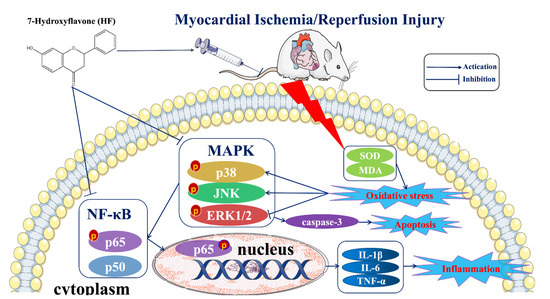 The accumulating evidence demonstrates that MI/RI causes myocardial oxidative stress and inflammation, which could eventually trigger apoptosis in the cardiomyocytes [6]. Mitogen-activated protein kinase (MAPK)/nuclear factor-κB (NF-κB) signaling pathways are involved in the above process of MI/RI [7,8,9]. Inflammation might be a significant factor in the whole pathophysiological progression of MI/RI [10]. A large number of inflammatory cells penetrate the area of the lesion soon after ischemia. The release of interleukin-6 (IL-6), interleukin-1β (IL-1β), and tumor necrosis factor-α (TNF-α) aggravate the myocardial injury, ultimately leading to apoptosis [11,12,13]. What is more, the acute response of inflammation and the infiltration of the inflammatory cells in the cardiomyocytes exacerbates myocardial damage. The occurrence of oxidative stress-triggered apoptosis during MI/RI is an additional factor [14]. Thus, reducing the inflammatory response, oxidative stress, and apoptosis could protect the cardiomyocytes from MI/RI.