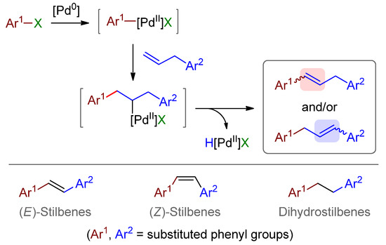 The Heck reaction has perpetuated its significance in synthetic organic chemistry for over half a century. Indeed, the introduction of this carbon-carbon bond-making cross-coupling reaction by Heck and Mizoroki has revolutionised synthetic methodology, thanks to its simplicity and effectiveness [1,2,3,4,5]. Since the first detailed mechanism was proposed by Heck and Nolley in 1972 [2], the elementary steps, reaction parameters and catalytic systems have counted among the major aspects attracting the interest of many researchers [4,6]. One crucial part of the Heck catalytic cycle, that sometimes receives little attention by synthetic chemists, is the β-hydride elimination elementary step. This process plays a key role in enantioselective versions of the reaction, for which it must proceed with suitable regioselectivity [7,8,9,10]. Control is also essential in so-called reductive Heck reactions for which, conversely, β-hydride elimination is to be avoided [11]. In relation to this context, the synthesis of 1,3-diarylpropene derivatives by the Heck reaction is especially worthy of study. Indeed, when the two aromatic groups differ, two possible regioisomers can be produced (Scheme 1).