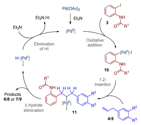 The mechanism of the Heck reaction and the exact nature of the intermediate palladium complexes involved have been extensively studied and discussed [3,4,5,6]. A simplified view is displayed in Scheme 3. A pre-activation step generated palladium(0), which then underwent the oxidative addition of the aryl iodide substrate 3. This produced the intermediate complex 10, where the palladium atom was attached to the ortho amido-substituted aryl group. Coordination of the allylbenzene reactant 4 or 5, followed by syn 1,2-insertion of the C=C bond, gave rise to the alkylpalladium species 11. The next step was a syn β-hydride elimination which, after de-coordination, delivered the product: 6 or 7 from 4 or 8 or 9 from 5, along with a palladium(II) hydride species. Finally, the palladium(0) catalyst was regenerated in a reductive elimination process.