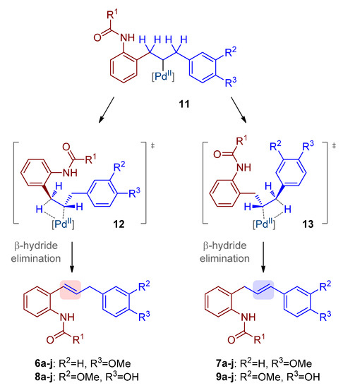 Proposed transition states of the β-hydride elimination step from 11, leading either to regioisomers (E)-6/8 or (E)-7/9.