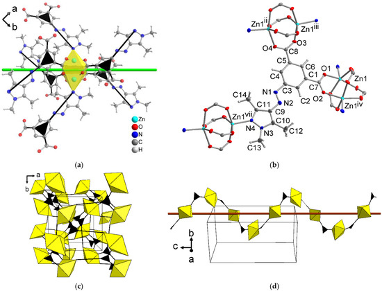 Paddlewheel clusters are commonly found in Zn-MOFs, with Zn-HKUST-1 and SDU-1 being two examples [26,27]. These paddlewheel clusters can exhibit symmetries up to D4h depending on the symmetries of the ligand and the molecules or ligands in axial positions. Due to the low symmetry of Isa-az-tmpz2–, the clusters in the network [Zn(Isa-az-tmpz)] have a reduced C2 symmetry without an inversion center or mirror faces (Figure 2b).
