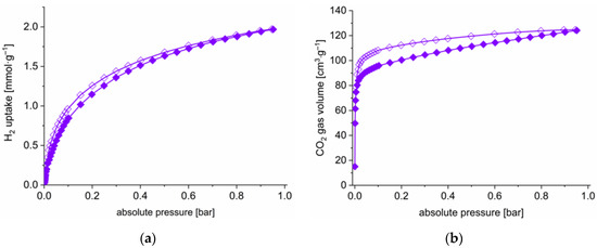 (a) Volumetric H2 (at 87 K,) and (b) CO2 (at 195 K) sorption isotherms of activated [Zn(Isa-az-tmpz)] (sc-dried and additionally heated for 3 h at 120 °C) (filled symbols for adsorption, empty symbols for desorption).