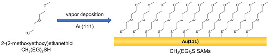Chemical structure of CH3(EG)2SH and formation of CH3(EG)2S SAMs on Au(111) via vapor deposition.