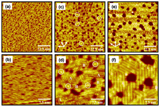 It has been demonstrated that higher thermal energy can greatly increase the diffusion rate of adsorbates and/or adsorbate–metal complexes during SAM formation, resulting in the formation of organic SAMs with improved structural quality showing large ordered domains and few structural defects [1,4,7,42,43,44,45]. When the vapor deposition temperature increases from 298 to 323 K, the surface features of the EG2 SAMs on Au(111) remarkably changed from the disordered phase to a mixed phase of ordered and disordered phases with many small bright aggregates (the white circle) on the entire Au(111) surface, as shown in Figure 2c,d. It is clear from the STM image that the ordered phase was the dominant phase formed. In contrast, solution-deposited EG2 SAMs at the same preparation conditions (deposition temperature of 323 K and deposition time of 24 h) were dominated by the disordered phase, suggesting that solvent molecules with high thermal energy significantly prevent two-dimensional (2D) ordering of EG2 SAMs at high solution temperature [56]. Our STM results strongly suggest that the structural order of EG2 SAMs was remarkably enhanced by vapor deposition and high deposition temperatures. On the other hand, it was found that the size of ordered domains in vapor-deposited EG2 SAMs ranged from approximately 2 to 8 nm, which were much smaller than those formed in solution-deposited EG2 SAMs, with the ordered domains sized larger than 60 nm formed even at a lower temperature of 298 K. From this result, we also consider that ethanol solvent considerably contributes to the formation of large ordered single domains even though poorly ordered molecular aggregates were embedded in the ordered domains [39]. Tri-directional small ordered domains rotated by a 60° or 120° angle are clearly visualized in Figure 2c (indicated by the arrows), suggesting that the formation of EG2 SAMs is due to the chemical interactions between the sulfur anchoring group and the Au(111) surface, as in the case of long-chain alkanethiol SAMs [5,35,36,37,38,39,40]. The magnified STM image in Figure 2d shows ordered molecular rows (indicated by A) and randomly adsorbed disordered regions (indicated by B). This STM observation revealed that although the structural order of EG2 SAMs is drastically enhanced at the deposition temperature of 323 K (Figure 2c,d), the uniform and fully ordered EG monolayers are still not formed.