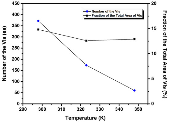 The number of VIs (circles) and the fraction of total area of the VIs (squares) for EG2 SAMs on Au(111) formed at 298 K, 323 K, and 348 K.