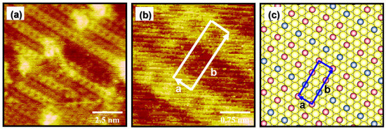 When the deposition temperature was increased from 323 K to 348 K, the surface structures of EG2 SAMs on Au(111) completely changed from a mixed phase to a fully ordered phase, as shown in Figure 2e,f. The magnified STM image in Figure 2f clearly shows that the disordered phases evident at 298 K or 323 K completely disappeared at 348 K. Moreover, the size of the ordered domains drastically increases from a few nanometers to larger than 10 nm at this elevated temperature. Interestingly, many small bright spots in the ordered domains conspicuously appeared, which have never been observed in alkanethiol SAMs [41,42,43,44,45]. It was found that a helical conformation of OEG SAMs is dominantly formed when the number of (EG)n units, n, is larger than 5, whereas OEG SAMs with the (EG)4 unit have a mixed conformation of helical and all-trans structures [32]. Based on this conformational change of EG units from the helical conformation to all-trans conformation as the number of EG units decreases, we assume that EG2 SAMs with two EG units prefer to have an all-trans conformation. Therefore, it is reasonable to consider that the well-ordered domains of EG2 SAMs on Au(111) have an all-trans conformation. From a molecular-scale STM study, we revealed that the uniform and well-ordered EG2 SAMs were formed by vapor deposition at a high deposition temperature of 348 K for 24 h. In addition, the phase transitions of EG2 SAMs on Au(111) occur from a disordered phase to a fully ordered phase via an intermediate phase showing the coexistence of two phases, i.e., the ordered and disordered phases.