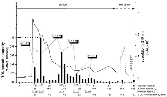 UV-chromatogram (λ 210 nm) of the HPCCC separation (right axis, solid and dotted line) and screening of TDN generating fractions by HS-GC-MS/MS (left axis, bar chart). α-values of CCC separation are given for TDN precursors. These values refer to the specific positions in the chromatogram that showed higher TDN formation and thus represent the separation of the structurally different precursors. The values are sufficient if they are greater than 1.5. (“calculations of countercurrent chromatographic separation parameters” are given in supplementary material).