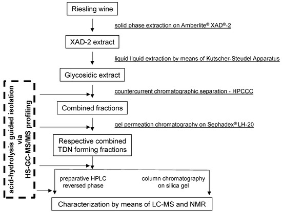 A commercial Riesling wine (100 L Pfalz Riesling QbA from the Moselland eG Winzergenossenschaft, Germany, vintage 2012) was used in this study. The extraction was conducted according to previous studies [30,31], and the different isolation steps are summarized in Figure 4. The Riesling wine (batches of 10 L) was first diluted with water (1/1, v/v) and passed through a column (80 cm × 5 cm) of Amberlite® XAD®-2 resin. Afterwards, the column was thoroughly rinsed with water (6 L) before the precursor fraction was eluted with methanol (3 L). The methanolic fractions were combined, carefully concentrated in vacuo (30 °C) and lyophilized. The redissolved batches of this residue (aprox. 5 g in 200 mL water) were extracted by liquid–liquid extraction (Kutscher–Steudel perforator) with n-pentane/dichloromethane (v/v; 2/1; 500 mL) and lyophilized. Aliquots (0.5–1.0 g) of the lyophilized extract (23 g) were subjected to HPCCC fractionation and subsequent purifications by gel permeation chromatography (Sephadex LH-20), as well as semi-preparative and/or analytical RP-18 HPLC, respectively. TDN-generating fractions were monitored by acid-catalyzed hydrolysis of the non-volatile precursors at pH 3.0 and subsequent headspace (HS)-GC-MS/MS analysis after each purification step.