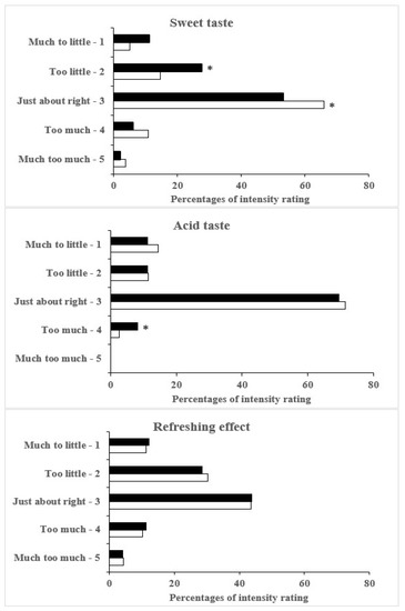 The results of consumer assessment of the appropriateness of intensity of selected attributes (sweetness, acidity, and refreshing effect) by JAR scale are summarized in Table 4. The results clearly deviate from normality, as mentioned by Bayarri et al. [57].