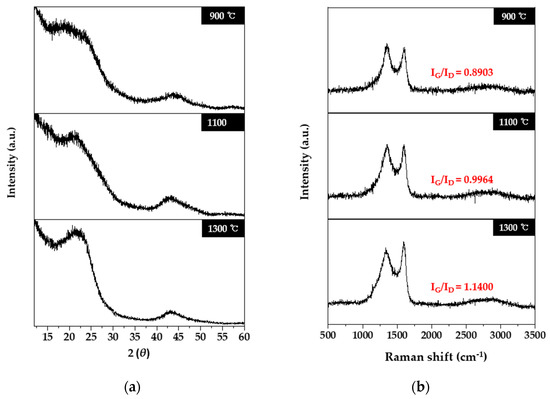 Figure 1a exhibits the XRD profiles of lyocell-based carbon fabrics obtained through various carbonization temperatures. All lyocell-based carbon fabrics displayed broad peaks at 24 and 43°, associated with the (002) and (100) planes, respectively. Notably, (002) lattice diffraction peak patterns were clear. These two peaks at 24 and 43° indicate the development of the graphitic crystalline structures [15,19,33,34,35,36,37,38]. In Figure 1a, with an increase in carbonization temperature to 900 °C, 1100 °C, and 1300 °C, the full width at half-maximum (FWHM) values at 2θ values of 24° decreased to 8.09, 7.28, and 6.59°, while the intensities of these respective peaks increased. These results demonstrated that lyocell-based carbon fabrics transformed into higher-degree graphitic crystalline structures upon increasing the carbonization temperature. To comprehend the conversion degree of the graphitic structure of the lyocell-based carbon fabrics obtained at the various carbonization temperatures, the Raman spectra of the sample were measured, which are shown in Figure 1b. As shown, the two peaks at 1351 and 1610 cm−1 were observed in all samples. The characteristic peak at 1351 cm−1 is related to the D-band, which describes the vibrations in the amorphous region, while the peak at 1610 cm−1 corresponds to vibrations corresponding to the ordered graphitic region for sp2 carbons. As the carbonization temperature increased, the intensity of the G band increased more than that of the D band, and thus, the peak ratios of the G/D bands (IG/ID) gradually increased. These results indicated that the graphitic crystalline structures expanded with the increase in carbonization temperature.